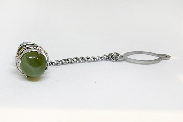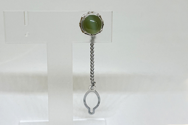オリーブグリーンのキャッツアイが、特徴的なタイピンですね。